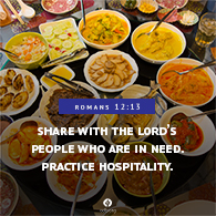 Read: Romans 12:9–18 Share with the Lord’s people who are in need. Practice hospitality.—Romans 12:13 My husband left for a month-long trip, and almost immediately I was overwhelmed by the needs of my job, our house, and our children. A writing deadline loomed. The lawn mower broke. My children were on school break and bored. How would I take care of all of these things on my own? I soon realized I wasn’t on my own. Friends from church showed up to help. Josh came over to fix my lawn mower. John brought me lunch. Cassidy helped with the laundry. Abi invited my kids over to play with hers so I could get my work done. God worked through each of these friends to provide for me. They were a living picture of the kind of community Paul describes in Romans 12. They loved sincerely (v. 9), considered the needs of others rather than just their own (v. 10), shared with me when I was in need, and showed hospitality (v. 13). Because of the love my friends showed to me, I remained “joyful in hope” and “patient in affliction” (v. 12), even the mild affliction of solo parenting for a month. My brothers and sisters in Christ became what one friend calls “God with skin on” for me. They showed me the kind of sincere love we ought to show to everyone, especially those in our community of faith (Galatians 6:10). I hope to be more like them. —Amy Peterson God, thank You for placing us in communities. Help me to look out for others’ needs and to show hospitality. To whom do I need to be “God with skin on” today? INSIGHT: The practice of hospitality is a key teaching in the New Testament. Jesus told His disciples to depend on the hospitality of those they ministered to (Matthew 10:11; Luke 10:7-8). Jesus also received hospitality from others (Mark 2:15; 14:3; Luke 7:36). Mary and Martha opened their home to Jesus (Luke 10:38), and this is probably where He stayed each time He came to Jerusalem (see Matthew 21:17). Luke mentioned a group of women who “were helping to support [Jesus and the twelve disciples] out of their own means” (Luke 8:3). The apostle John commended Gaius for his cheerful generosity and loving hospitality because he provided itinerant Bible teachers a place to stay (3 John 1:5-8). When we lovingly support ministry workers in practical ways, we are their partners in ministry (v. 8). Therefore, Paul urges us, “When God’s people are in need, be ready to help them. Always be eager to practice hospitality” (Romans 12:13 nlt). Peter echoed the same sentiment: “Most important of all, continue to show deep love for each other . . . . Cheerfully share your home with those who need a meal or a place to stay” (1 Peter 4:8-9 nlt). K. T. Sim |